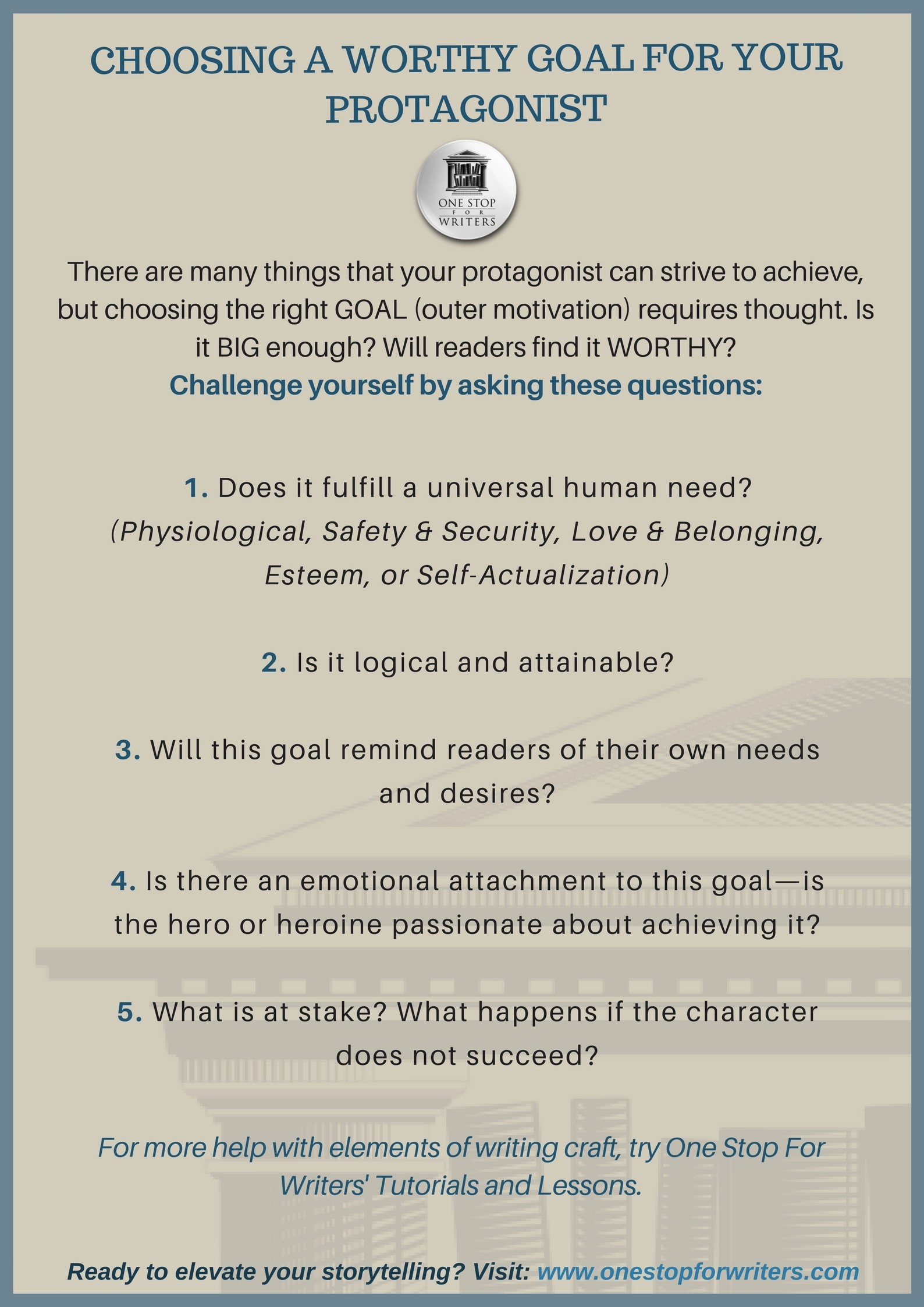 One Stop for Writers has a database of the most common goals found in fiction and film and shows you all the ways they can be used in storytelling. If you’re looking for help with Character Arc, Story Stakes, and ideas about how your character might prepare or change to achieve what seems to be an impossible goal, give the Free Trial a try and check it out.